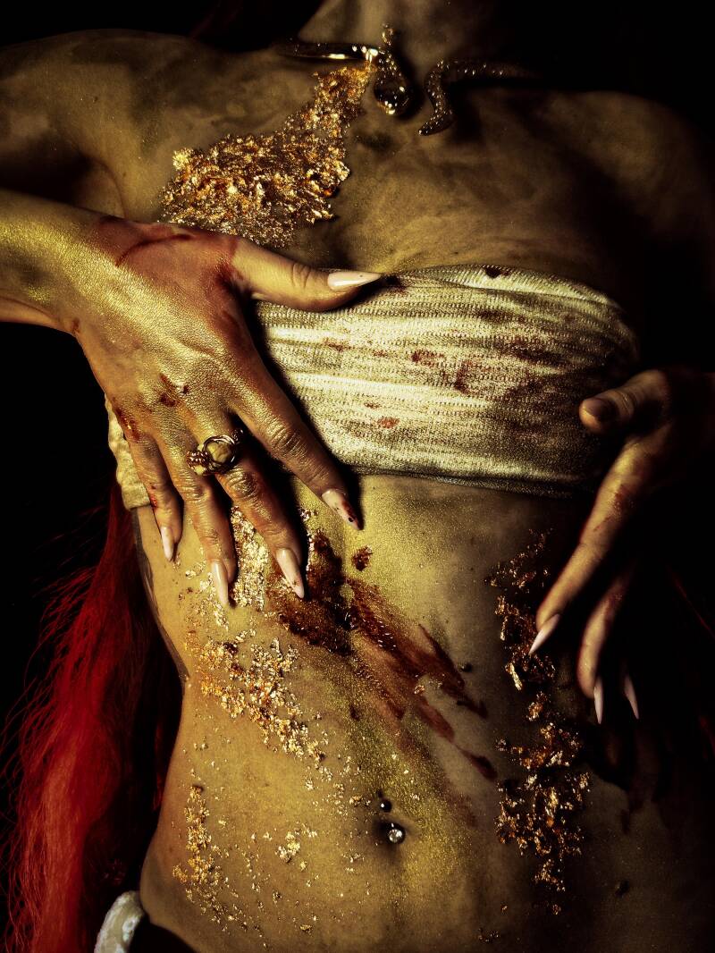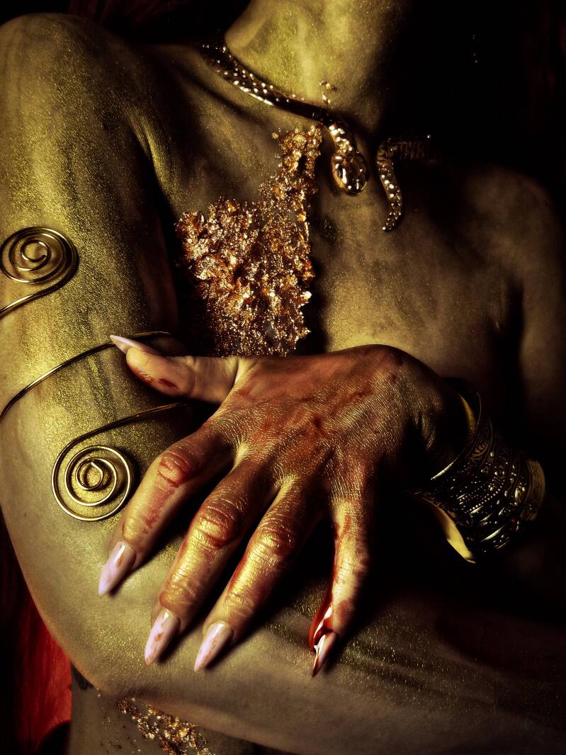 Le fotografie che seguono esplorano questa energia attraverso simboli antichi e universali: oro e sangue.